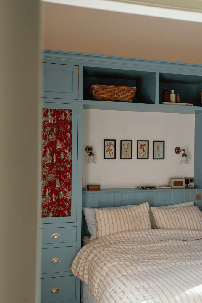 The solution Hugo designed was a wrap-around wardrobe with an integrated headboard. The wardrobe runs along two walls of the room, providing an enormous amount of hanging space, shelving, and drawers, more storage than we have ever had. The headboard section is built into the wardrobe structure, creating a sense of architectural intention, as though the room was designed as a single, unified piece rather than assembled from separate bits of furniture.