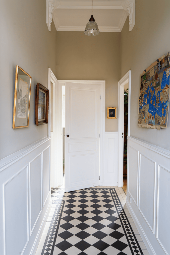 With the insulation in place and a new, lower ceiling installed, we turned our attention to making the hallway beautiful in a different way. The floor was covered in dated 1970s tiles that had no business being in a 19th century house. We ripped them out and replaced them with a classic black and white checkered pattern, a timeless choice that feels right for the period and adds a sense of elegance to the entrance.