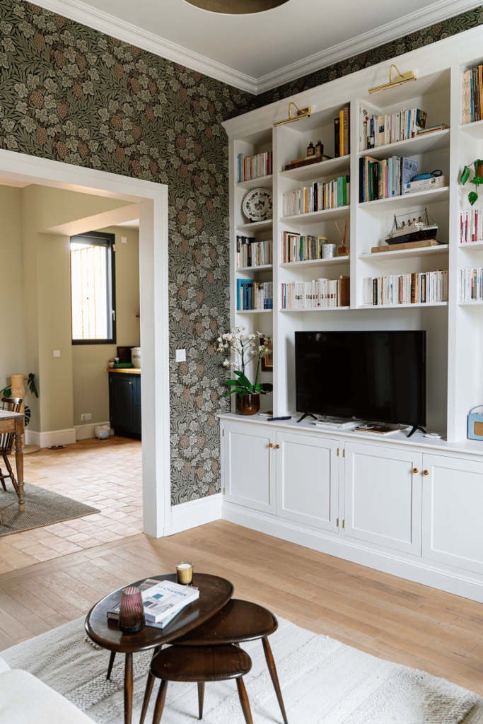 The green leaves echo the sage and green tones we have used in the dining room, creating a visual connection between the spaces. And the grapevine motif feels like a wonderfully appropriate choice for a house in Bordeaux, the wine capital of the world. There is a playfulness to it that we love, a little wink to our surroundings that visitors always notice and smile at. William Morris wallpapers are not cheap, but they are printed on heavy-weight paper with rich, saturated colours that no modern reproduction quite matches. It is one of those investments where you can see and feel the quality every single day.