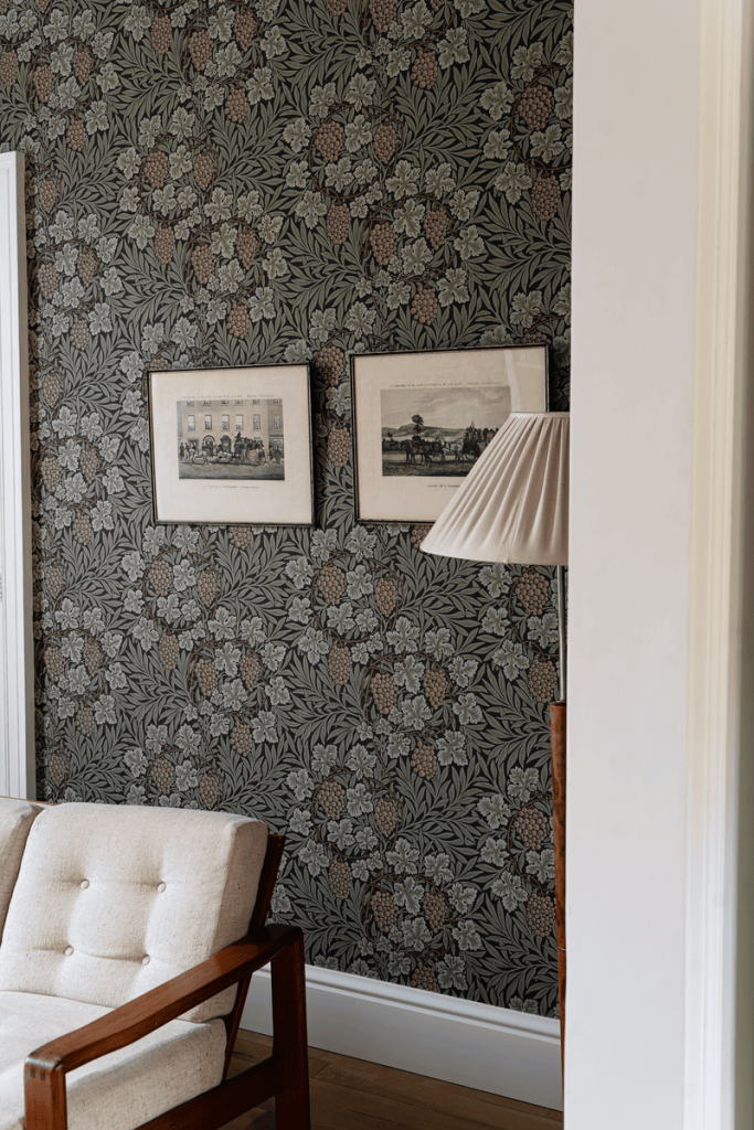 The centrepiece of the room’s transformation is the wallpaper. I had been longing to use a bold, patterned wallpaper somewhere in the house, and the living room felt like the perfect canvas. We chose Vine by William Morris, one of his most iconic designs, featuring rich, trailing grapevines with lush green leaves against a deep black background. It is a design that divides opinion, and we are well aware it is not to everyone’s taste. But for us, it is perfect.