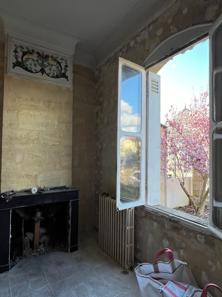 The history of the house is one of the things we love most about it. We believe it was built in the mid-1800s by the first violinist of the Bordeaux orchestra. If you look closely at the stone facade, you will spot charming musical details carved into the stonework, including a little lyre motif above the front door. These kinds of personal touches are what make old houses so special. Someone, over 150 years ago, wanted to leave their mark on this place, to declare who they were and what mattered to them. That sense of personal history layered into the very fabric of the building is something you simply cannot replicate in new construction.
